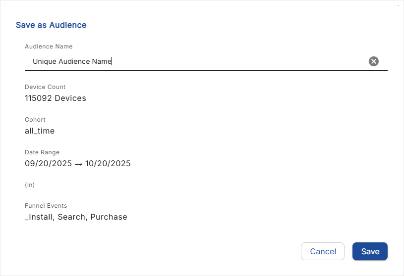 B. Click outside the funnel>Export Audience (sequence enforced): Resulting device ID’s may differ from funnel view which is built using Theta sketches where event sequence order is not enforced.