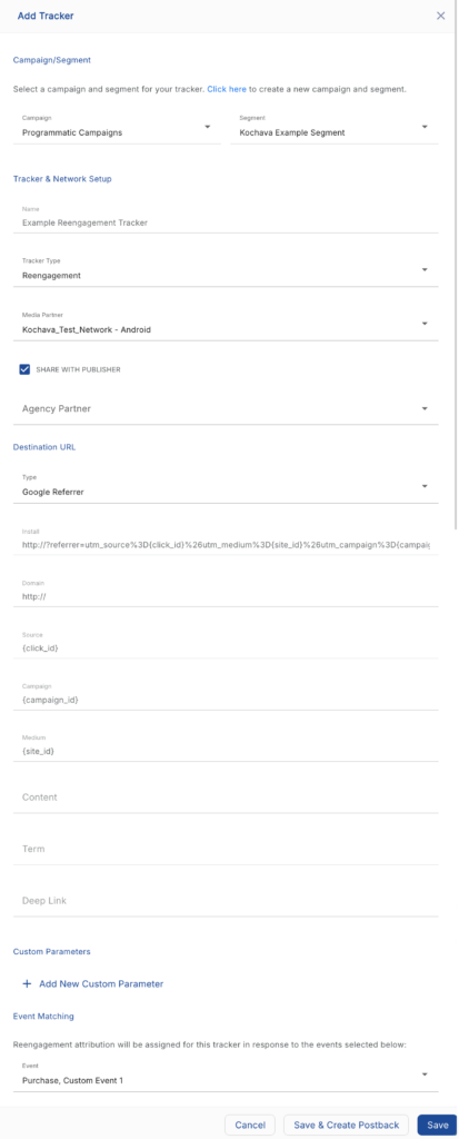 A reengagement campaign is designed to target users, who were active in an app and have ceased using it, with an offer to incentivize a desired in-app action. In a reengagement campaign, clicks are matched with events for attribution. The following document defines the process for creating a reengagement campaign within Kochava. If you are planning on running a re-install reengagement campaign you will want to first make sure you have updated the install reprocessing lookback window, this process is outlined here.
